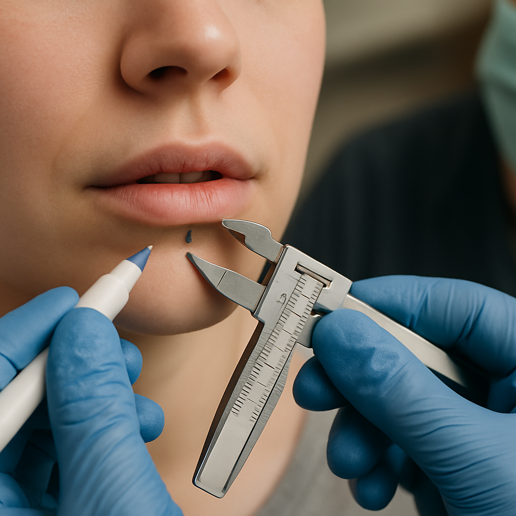 Ein erfahrener Piercer markiert die Stelle sowohl im entspannten Mundzustand als auch beim leichten Lachen. So lässt sich vermeiden, dass das Piercing in Bewegung die falsche Stelle belastet. Und ja: Schreibe Dir das hinter die Ohren — Nachmessen ist kein Overkill, sondern Pflicht.